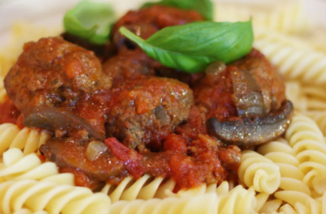 Place the meatballs in the slow cooker, add the tomatoes, tomato puree, mushrooms and stock. Cook on High for 3 hours.