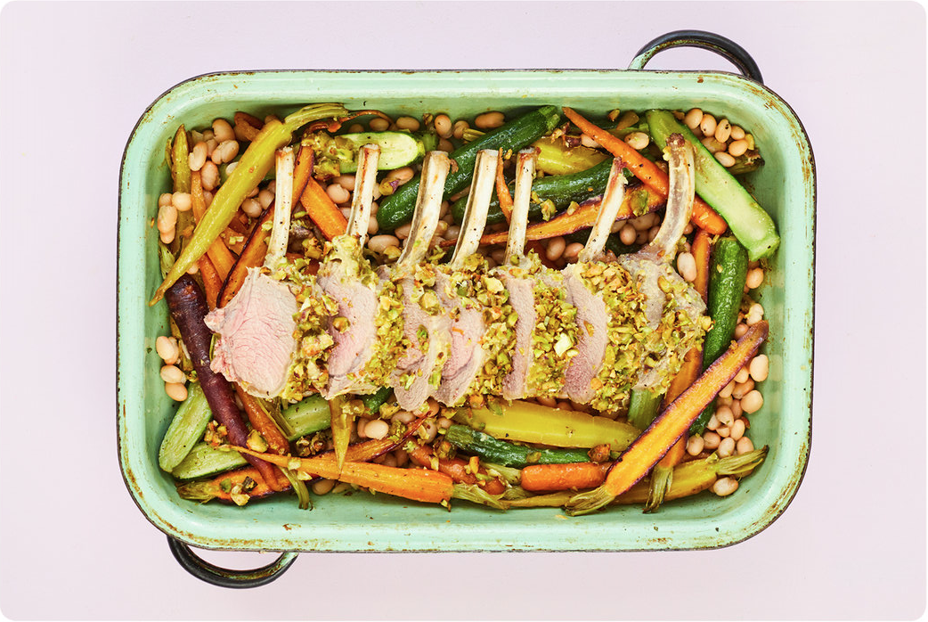 Once the lamb has rested, use a sharp knife to slice it into neat medallions (do this at a slight angle to cut between the bones) and arrange them over the vegetables in the tin.