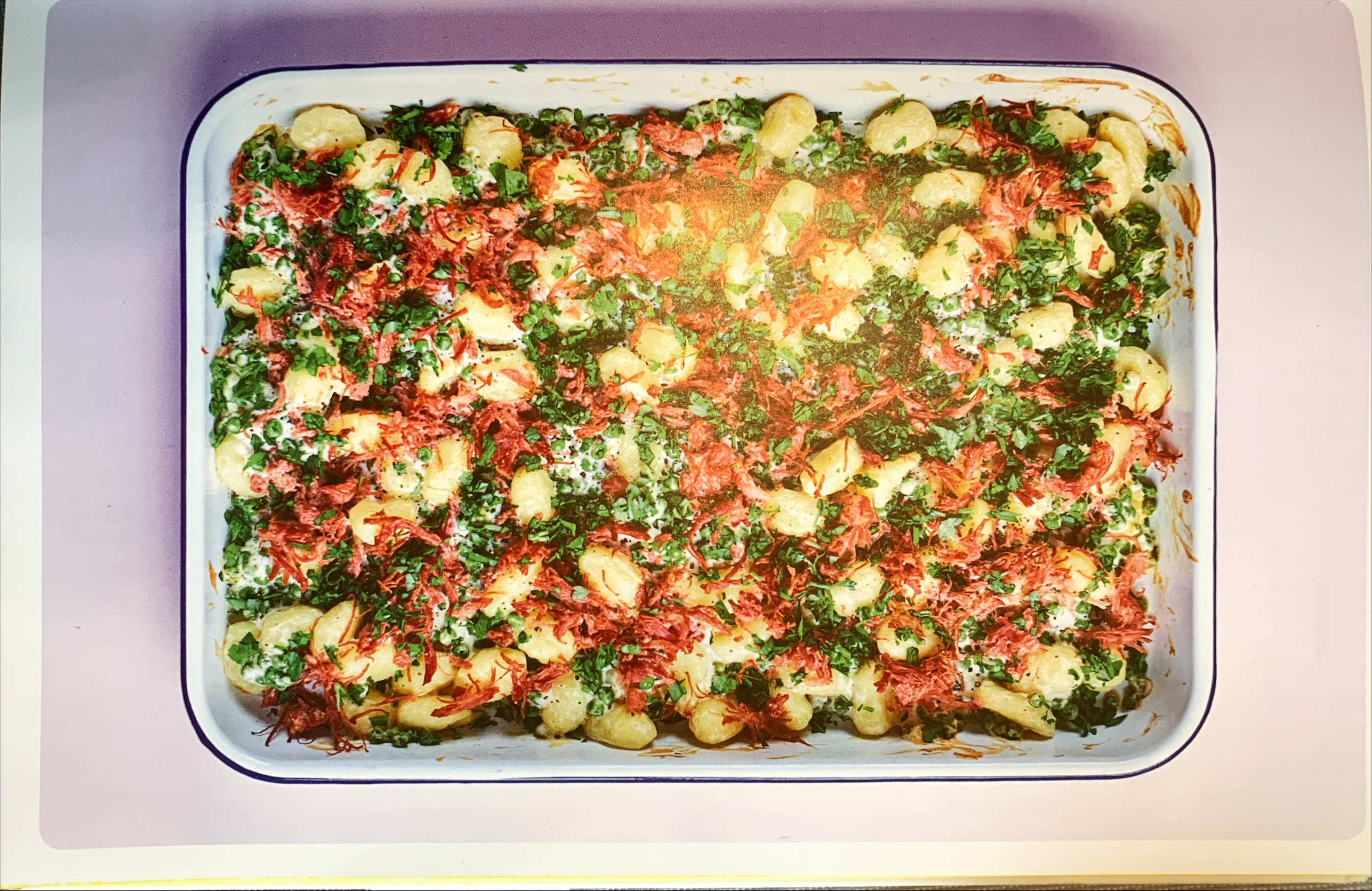 Let it stand for 2 minutes, then drain well and tip the gnocchi into a roasting tin along with the peas, crème fraiche, mustard, salt (if using) and freshly ground black pepper.