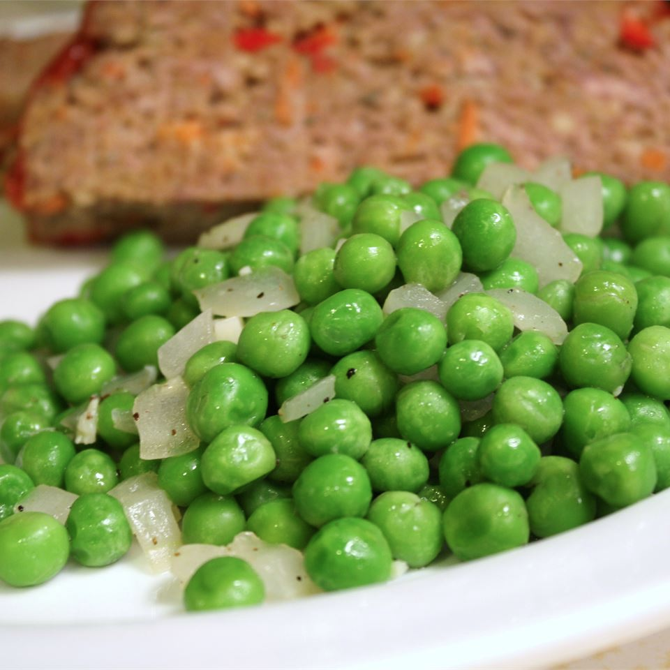 Heat olive oil in a skillet over medium heat. Stir in onion; cook until softened, about 5 minutes. Stir in garlic and cook for 1 minute. Add frozen peas, and stir in stock. Season with salt and pepper. Cover, and cook until the peas are tender, about 5 minutes.