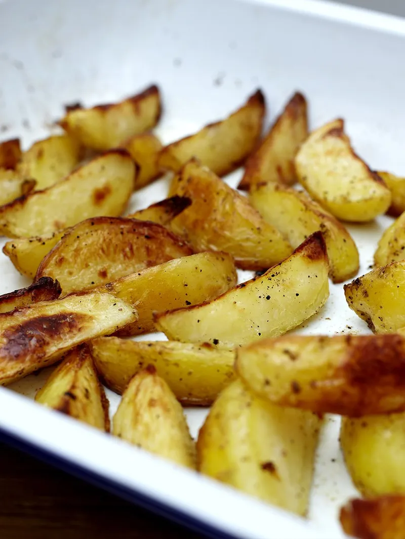 Transfer to a roasting tray and add a good lug of olive oil and a pinch of salt and pepper. Toss together so all the wedges are coated in the oil then spread out in one layer. Cook in the hot oven for 30 minutes until golden, crisp and cooked through. Delicious served with steak or chicken.