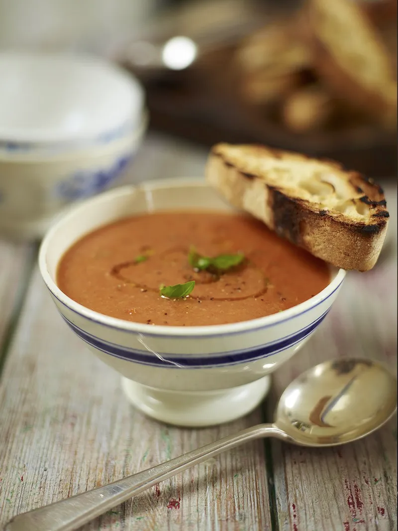 - Once finished, mix well, season to taste and top with a dollop of créme fraiche, a few basil leaves and a drizzle of extra virgin olive oil. Take to the table with a stack of soup bowls and the tray of croutons from the oven.