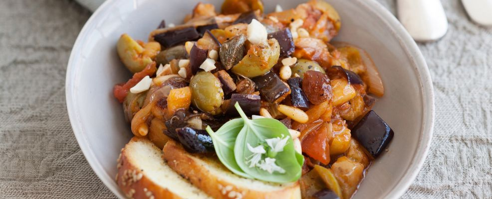 Add 2 tablespoons of vinegar, the sugar, capers, olives and aubergines.