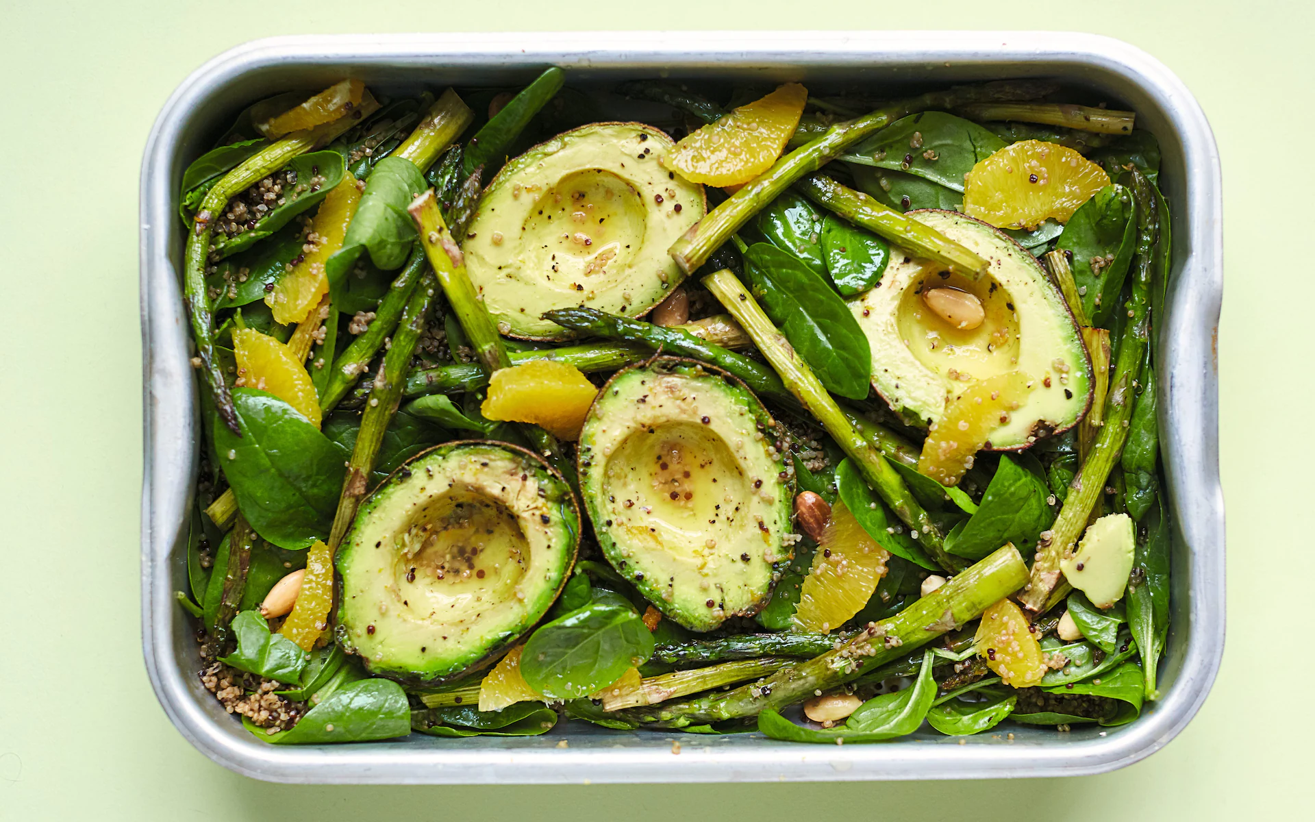 Once the avocados and asparagus have had 15 minutes, tip the quinoa, spinach and orange segments into the tin.