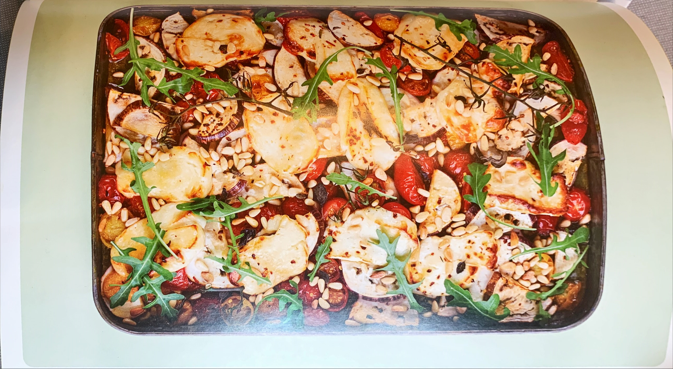 Transfer to the oven and roast for 20 minutes, then scatter the pine nuts on top before roasting for a further 10 minutes until the halloumi is golden brown and the aubergines are cooked through.